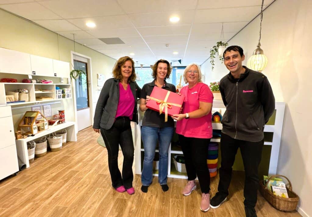 Soufyan el Hamdi (Lid Raad van Bestuur, rechter zijde ) verrast het team van de Maalderij tijdens de opening met een box vol feestelijkheden en cadeaus.
