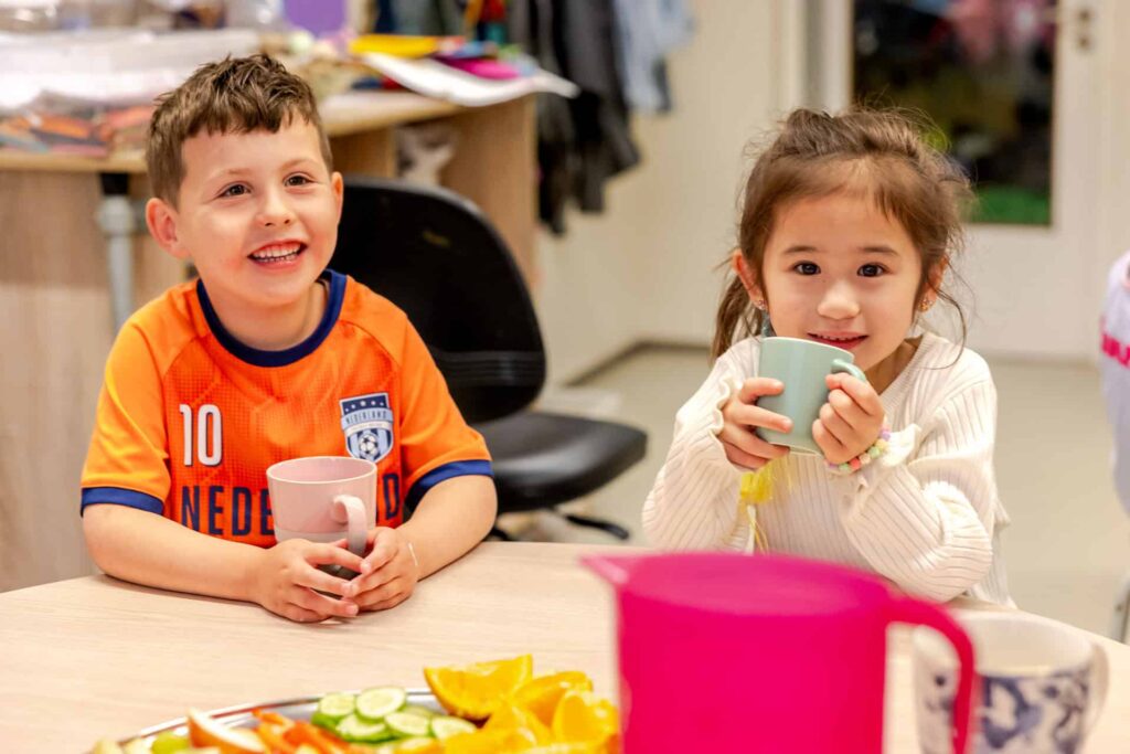 Als alle kinderen binnen zijn, starten we met een tafelmoment. Daar eten en drinken we iets gezonds. We grijpen dit moment gelijk aan om met de kinderen bij te praten.